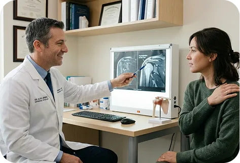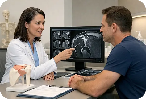 During the evaluation, the surgeon reviews your symptoms and performs a physical exam to assess shoulder strength, movement, and pain patterns that may indicate rotator cuff dysfunction.